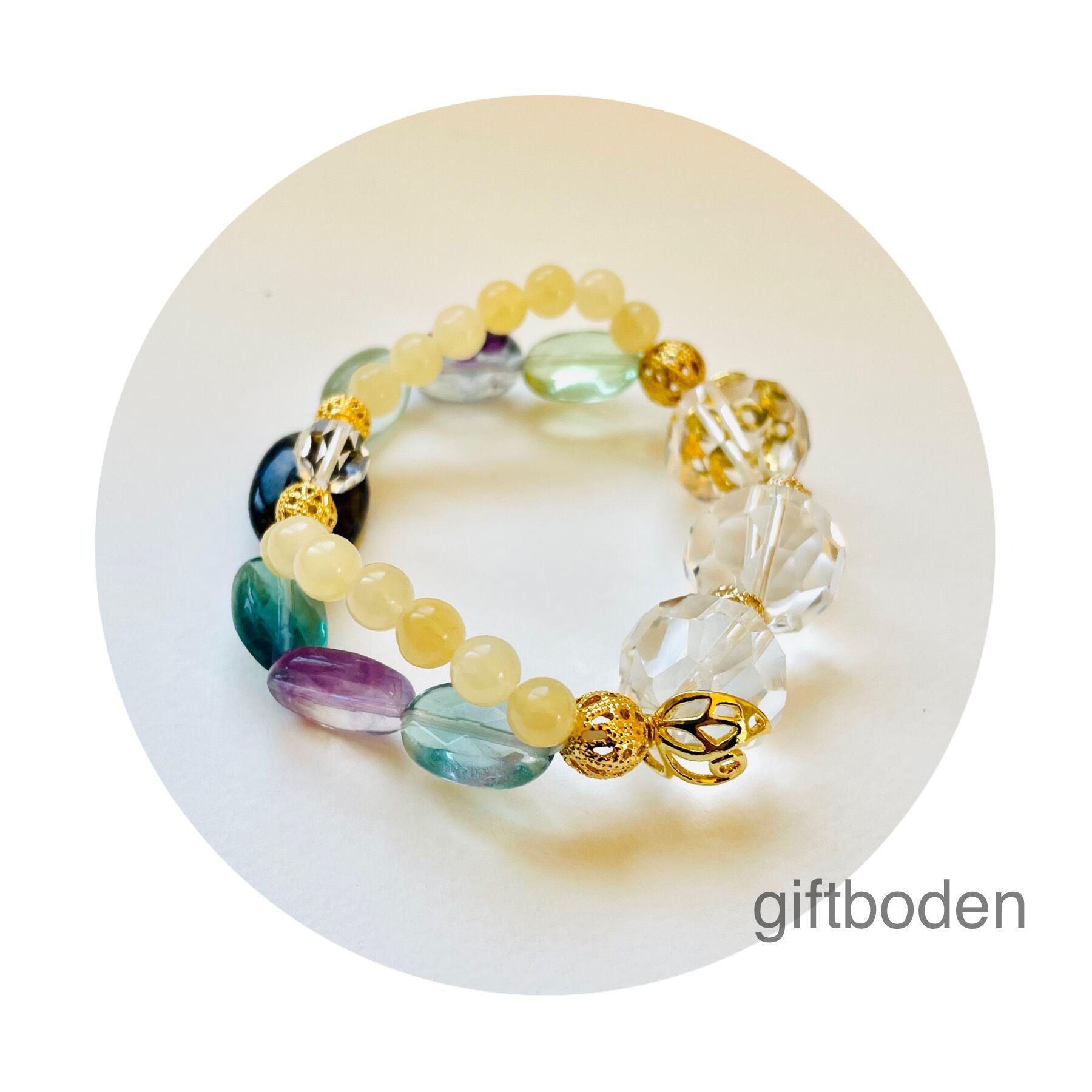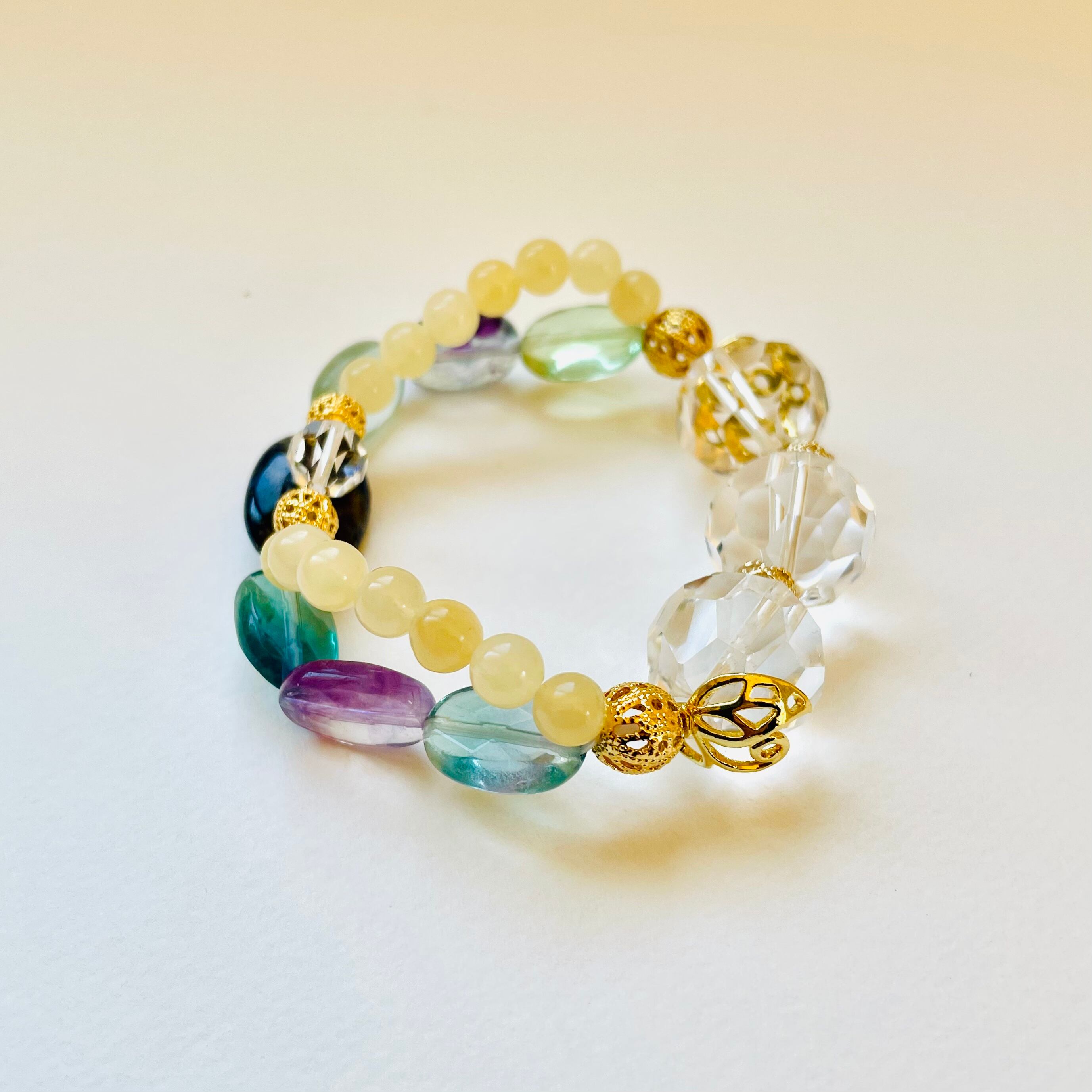 大粒バッキーボールの煌めきはすばらしいのは勿論、マルチカラーのフローライトとイエローカルサイトが絡み中央の濃紺のラピスラズリで締ります。とても品があるブレスレットです。