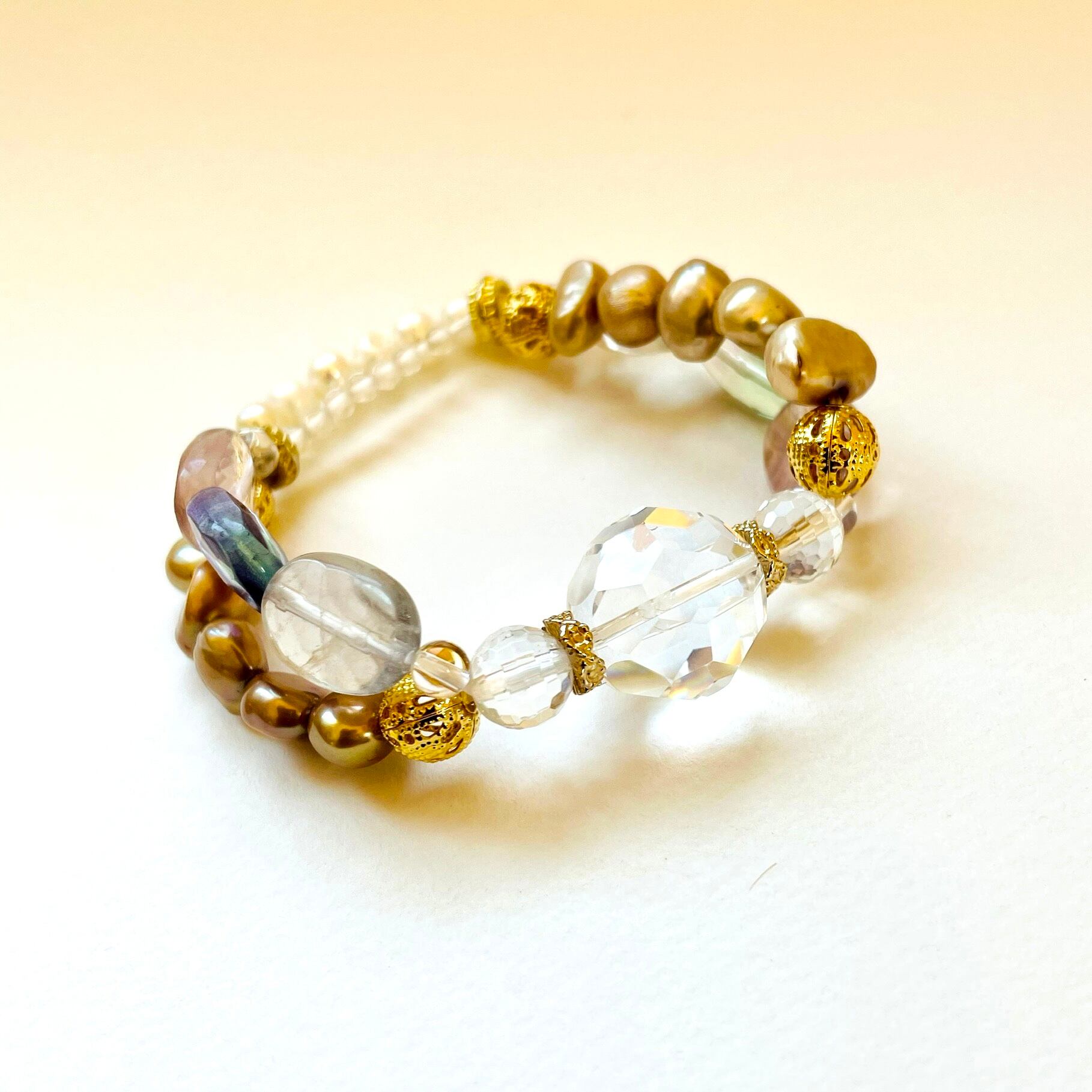 ブラウンとホワイトの淡水パールの絶妙な色と粒の不揃い加減が何ともかっこいいブレスレットです。バッキーボール水晶とマルチカラーフローライトの煌めき絡まりとても美しいです。